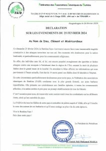 Après l’attaque survenue dans la communauté catholique d’Essakane-Village à Dori, le même jour, «une attaque a également eu lieu contre une mosquée à Natiaboani, dans la région de l’Est du pays. Le bilan provisoire fait état de 14 fidèles morts dont le grand imam de la localité, a indiqué la FAIB dans un communiqué rendu public le lundi 26 février 2024.
